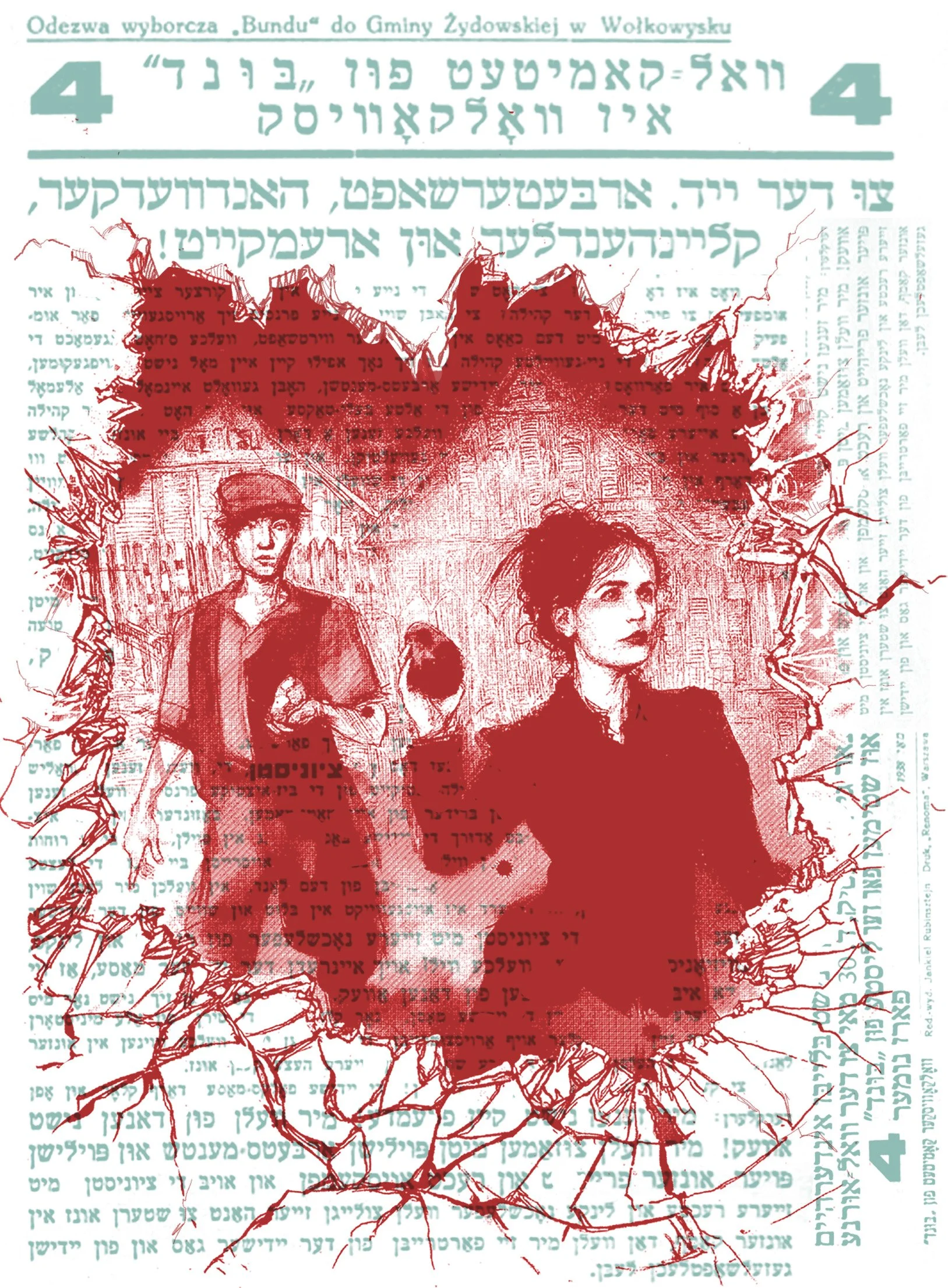 Artwork postcard by Molly Crabapple featuring her illustration above an election flyer from Volkovsyk in 1938: “The Jewish masses must clearly and openly declare: We are not foreigners! We will not leave! We will fight for our freedom and rights, together with Polish workers and peasants. And if the Zionists … raise a hand to hinder our struggle, then we will kick them off the Jewish street.”